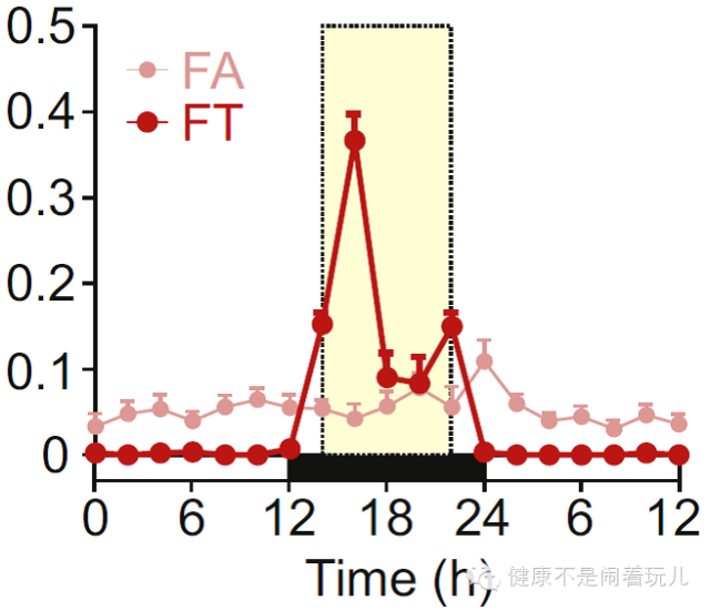 图5,随时组(FA)和限时组(FT)的进食曲线。黄色区域为限时组供应食物时间。