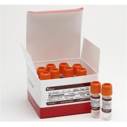 Puromycin is widely used in cell biology as a selection antibiotic agent in mammalian cell culture systems. The recommended working concentration ranges from 0.2–5.0 µg/mL, although it can be toxic to eukaryotic cells at concentrations as low as 1 µg/mL. Gibco® Puromycin Dihydrochloride is supplied at 10 mg/mL in 20 mM HEPES buffer (pH 7.2–7.5) in 10 vials each containing 1 mL.