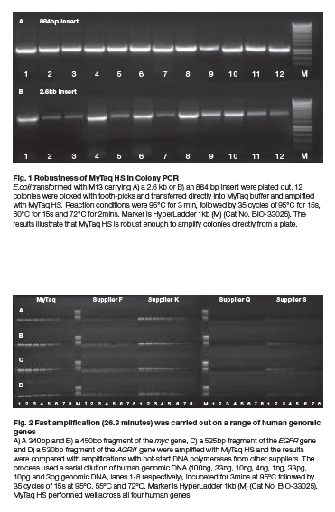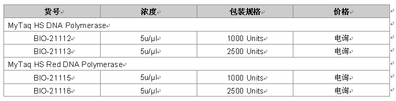 MyTaq™ HS DNA Polymerase是由抗体介导的热启动高性能PCR产品,专为快速,高特异性,热启动PCR设计。MyTaq HS在反应设置中不具有聚合酶活性,因此减少了非特异性应用,包括引物二聚物的形成。MyTaq HS先进的配方允许快速延伸,缩短循环时间,在不影响PCR特异性和产量的情况下,大大减少反应时间(图1)。Bioline这种酶含有5倍的MyTaq缓冲液,它包含最佳浓度的dNTPs,氯化镁和增强剂,这种特定的配方节省了时间并且更能保证运行出更好的结果。MyTaq HS Red formμlation这种特别设计不干扰PCR反应,并且用户在PCR反应后不需要添加缓冲液直接可加到凝胶上。