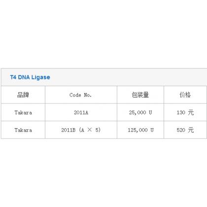 T4 DNA Ligase 品牌 Code No. 包装量 价格 说明书 Takara 2011A 25,000 U 130 元 Takara 2011B (A × 5) 125,000 U 520 元 制品内容