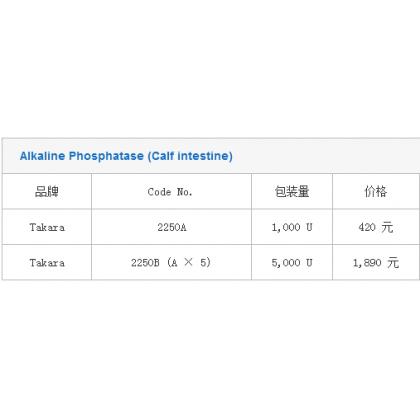 Alkaline Phosphatase (Calf intestine) 品牌 Code No. 包装量 价格 说明书 Takara 2250A 1,000 U 420 元 Takara 2250B (A × 5) 5,000 U 1,890 元
