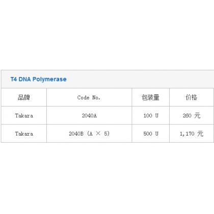 T4 DNA Polymerase 品牌 Code No. 包装量 价格 说明书 Takara 2040A 100 U 260 元 Takara 2040B (A × 5) 500 U 1,170 元