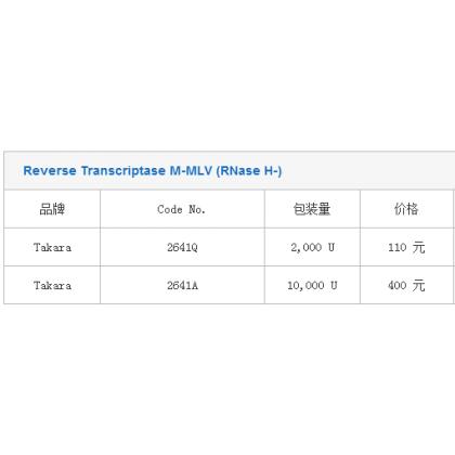 Reverse Transcriptase M-MLV (RNase H-) 品牌 Code No. 包装量 价格 说明书 Takara 2641Q 2,000 U 110 元 Takara 2641A 10,000 U 400 元 Takara 2641B (A × 4) 40,000 U 1,260 元