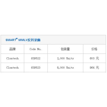 SMART™ MMLV反转录酶 品牌 Code No. 包装量 价格 Clontech 639522 2,000 Units 603 元 Clontech 639523 8,000 Units 964 元 Clontech 639524 20,000 Units 2170 元