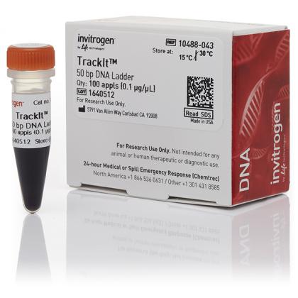 TrackIt™ 50 bp DNA Ladder is pre-mixed with sample buffer for ready-to-load convenience and room temperature storage. It consists of 16 blunt-ended fragments at 50 bp increments, and is suitable for sizing double-stranded DNA from 50 to 800 bp. This ladder can be stained with SYBR® Safe, ethidium bromide and other nucleic acid stains or radiolabeled using T4 polynucleotide kinase or T4 DNA polymerase. For easy reference on agarose gels, the 350 bp band is two- to three-times brighter than the other bands in the ladder.