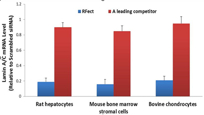 Fig.1.Superior knockdown with RFectPM transfection reagent compared with a leading competitor on difficult transfection primary cells. These primary cells were transfected with Lamin A/C siRNA (final concentration:10nM) using RFectPM and the reagent of a leading competitor.