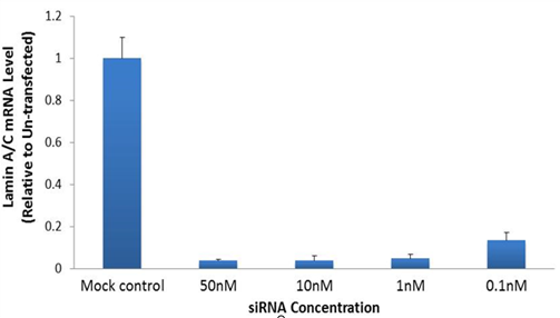 Fig.2. RFectPM transfection reagent offers high level of gene knockdown with low concentration of siRNA. Lamin A/C siRNA-RFectPM transfection complexes were prepared in 96-well plates, and then bovine chondrocytes were added to each well.